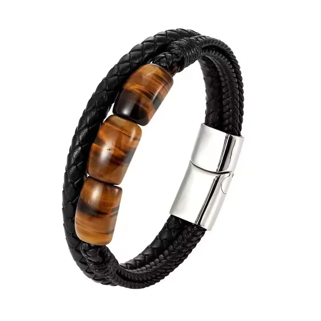 Náramek je tvořený dvěma díly kvalitní kůže černé barvy. Díly jsou pletené a na jednom z nich se nacházejí kameny tygřího oka. Zapínání je magnetické, otevírá se do strany. Zámek je vyrobený z nerezové oceli. Náramek je vhodný do společnosti i neformální příležitosti, je elegantní a zároveň decentní. Délka náramku činí 19 až 23 cm, dle zvolené varianty. Pokud si nejste jistí velikostí náramku, podívejte se na stránku Jak vybrat velikost.