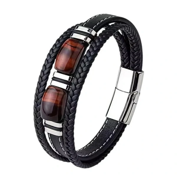 Náramek je tvořený třemi díly kvalitní kůže černé barvy. Postranní díly jsou pletené a prostřední hladký s kameny tygřího oka. Zapínání je magnetické, otevírá se do strany. Zámek je vyrobený z nerezové oceli. Náramek je vhodný do společnosti i neformální příležitosti, je elegantní a zároveň decentní. Délka náramku činí 19 až 23 cm, dle zvolené varianty. Pokud si nejste jistí velikostí náramku, podívejte se na stránku Jak vybrat velikost.
