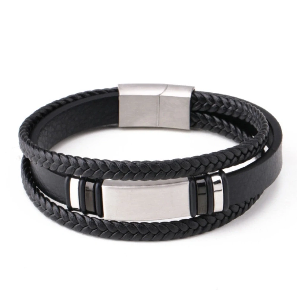 Náramek je tvořený třemi díly PU kůže černé barvy. Dva krajní díly jsou ozdobně pletené, střední díl je plochý. Uprostřed náramku se nachází ozdobné prvky z nerezové oceli. Zapínání je magnetické a otevírá se do strany. Náramek je vhodný do společnosti i pro neformální příležitosti, je určen mužům s běžným zápěstím. Délka náramku činí 20 nebo 22 cm podle zvolené varianty. Pokud si nejste jistí velikostí náramku, podívejte se na stránku Jak vybrat velikost.